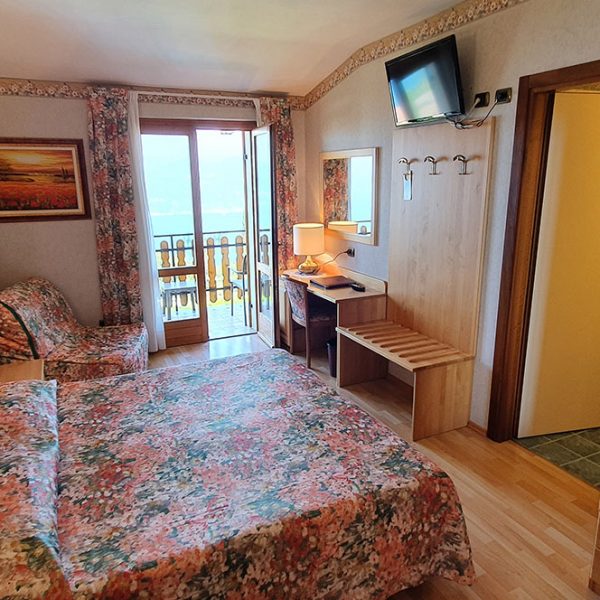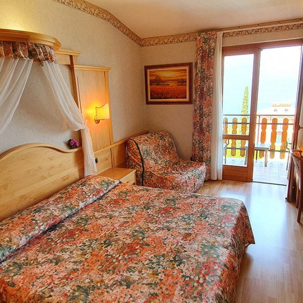 Camera doppia situata al 3º piano con balcone con spettacolare vista diretta del lago. La camera, arredata in stile romantico, dispone di frigobar, cassaforte, TV LCD 32”, telefono con linea diretta, parquet. Bagno in ceramica con doccia, bidet, asciugacapelli, set cortesia, specchio per trucco.