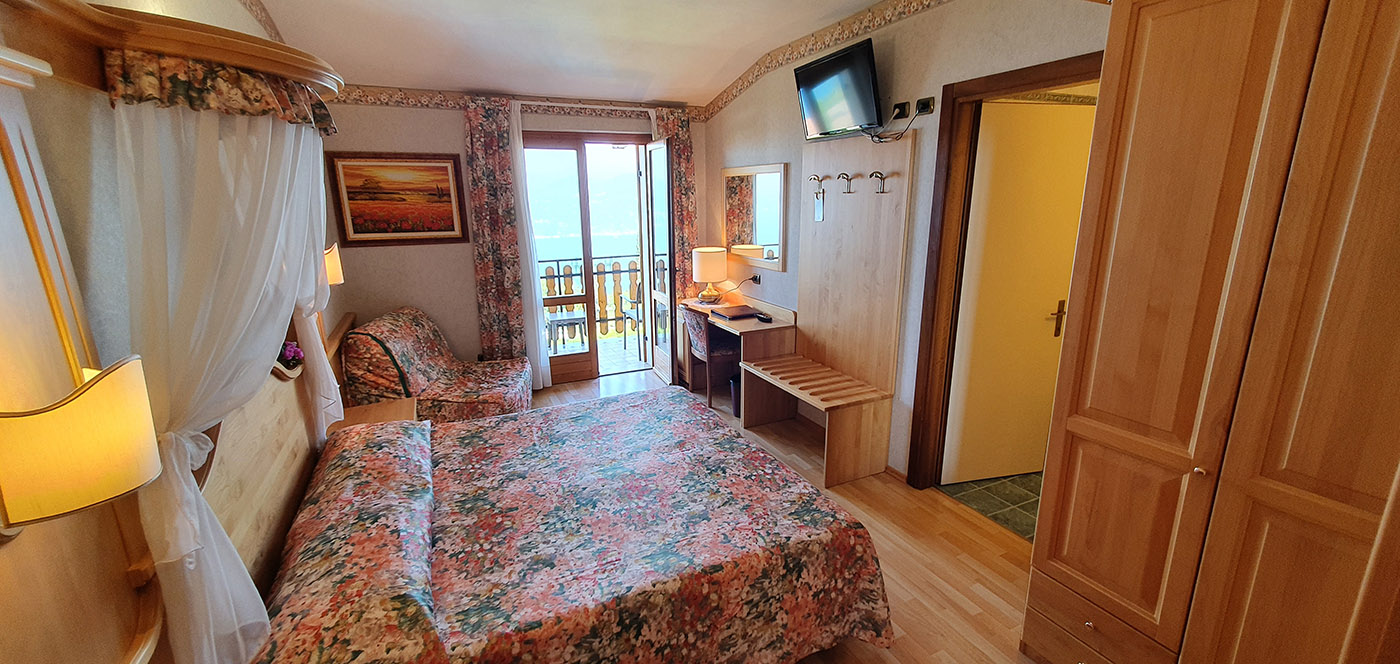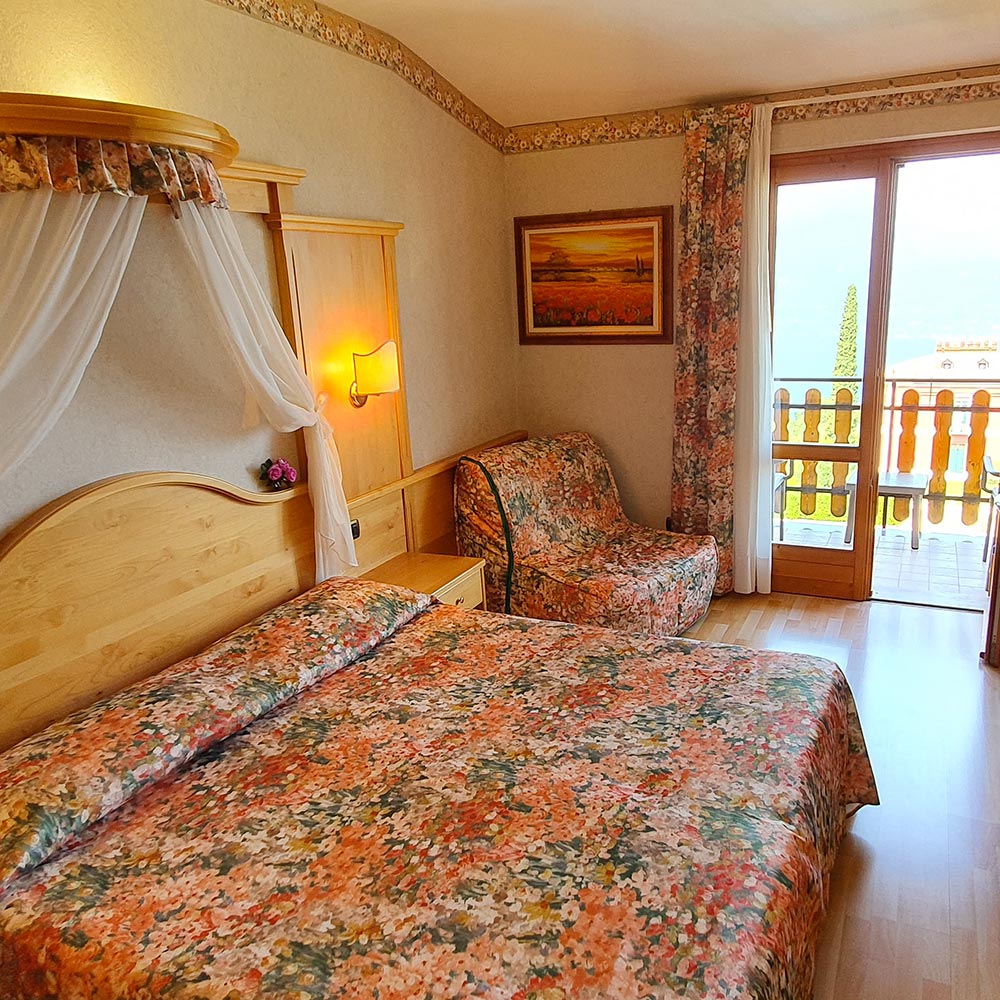Camera doppia situata al 3º piano con balcone con spettacolare vista diretta del lago. La camera, arredata in stile romantico, dispone di frigobar, cassaforte, TV LCD 32”, telefono con linea diretta, parquet. Bagno in ceramica con doccia, bidet, asciugacapelli, set cortesia, specchio per trucco.
